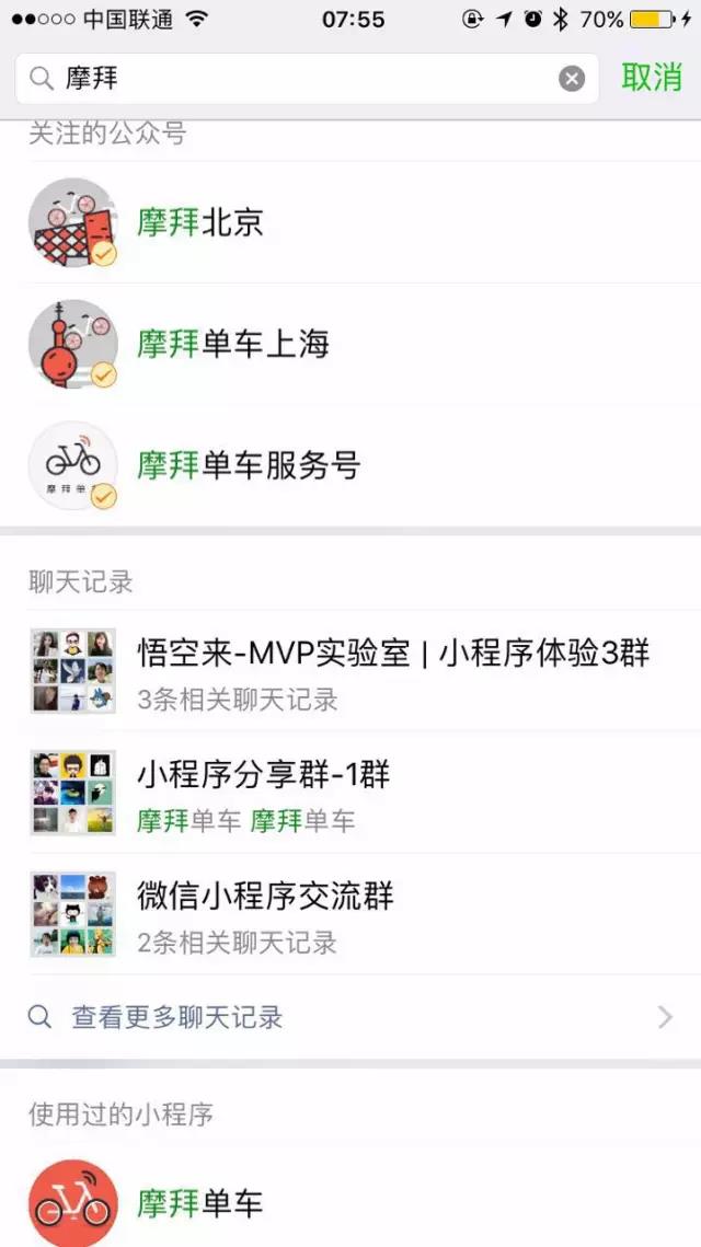 另外一个入口是微信聊天窗口顶部的搜索,会显示该名称下的公众号以及小程序。
